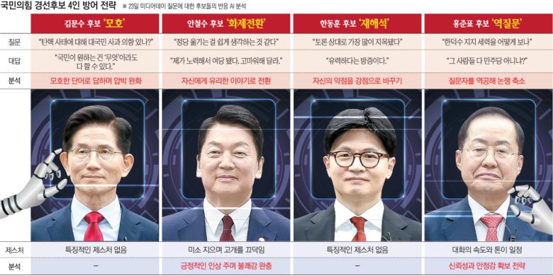 AI는 각 후보가 '구체성 희석'(김문수), '화제 전환'(안철수), '재해석'(한동훈), '역질문'(홍준표)이란 각기 다른 방식의 방어 전략을 구사했다고 평가했다. 전날(23일) 국민의힘 '미디어데이'에서 나온 질문과 그에 따른 각 후보들의 반응을 분석한 결과다.