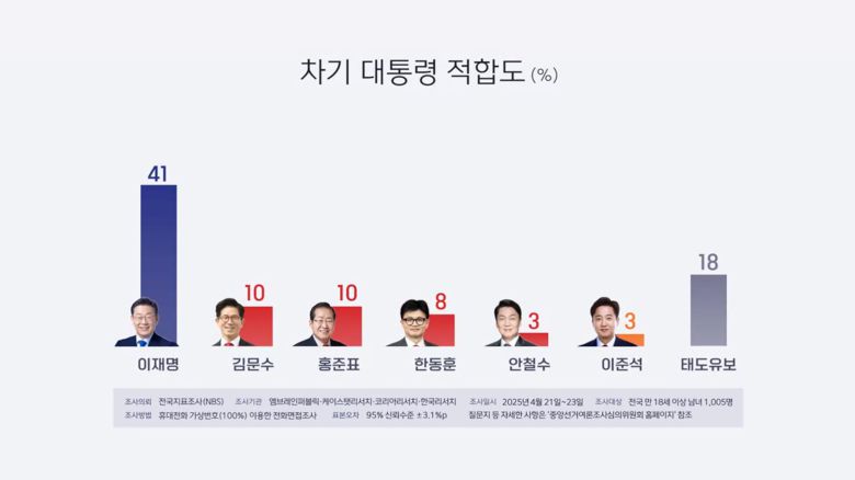 한국리서치 등 4개 여론조사 기관이 지난 21일부터 사흘간 만 18세 이상 남녀 1,005명을 대상으로 진행한 전국지표조사에서, 이 후보의 차기 대통령 적합도는 41%로 집계됐습니다.