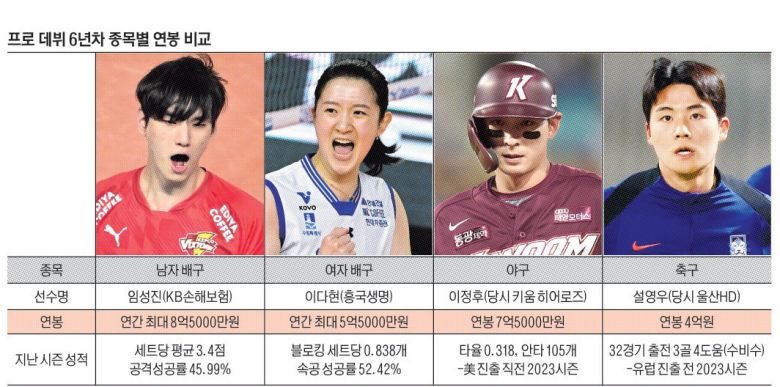축구선수 중 국가대표 주전 수비수로 자리매김한 설영우(츠르베나 즈베즈다)가 지난 시즌 챔피언 울산HD 소속으로 받은 연봉이 4억원이다. KBL에서는 프로 데뷔나 동갑내기 선수와의 비교가 불가하다. 전체 연봉 1위 문성곤(KT)이 기록한 7억5000만원이다.