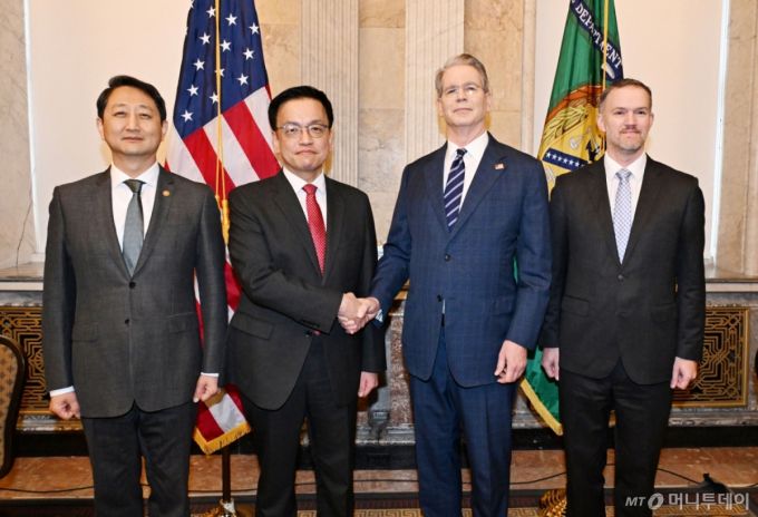 '한미 2+2 통상 협의'는 미국 관세정책에 대한 협의 방안 등을 논의한 첫 번째 공식협의다. 이날 오전 8시10분 시작해 1시간8분 동안 진행됐다. 미국 측에선 스콧 베센트 재무부 장관과 제이미슨 그리어 미국무역대표부(USTR) 대표가 협상 테이블에 앉았다.