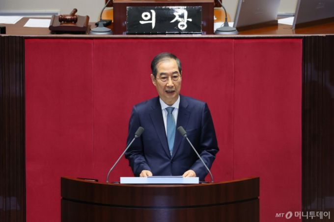 한덕수 대통령 권한대행 국무총리가 24일 서울 여의도 국회 본회의장에서 2025년도 제1회 추가경정예산안에 대한 정부의 시정연설을 하고 있다. (총리실 제공, 재판매 및 DB 금지) 2025.4.24/사진=뉴스1 /사진=(서울=뉴스1) 임세영 기자