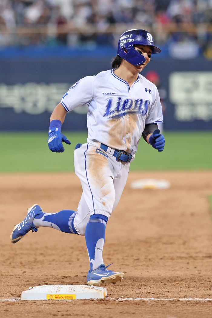 삼성 김성윤이 24일 대구삼성라이온즈파크에서 열린 2025 KBO리그 KIA전에서 5회말 솔로포를 때린 후 베이스를 돌고 있다. 사진 | 삼성 라이온즈 |