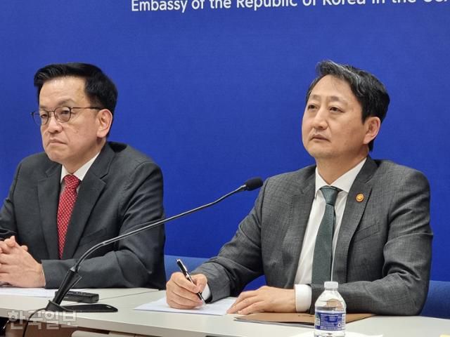 최상목(왼쪽) 부총리 겸 기획재정부 장관과 안덕근 산업통상자원부 장관이 24일 미국 워싱턴 주미대사관에서 한미 ‘2+2 통상 협의’ 첫 회의 결과를 소개하는 브리핑을 열어 취재진의 질문을 듣고 있다. 워싱턴=권경성 특파원 |