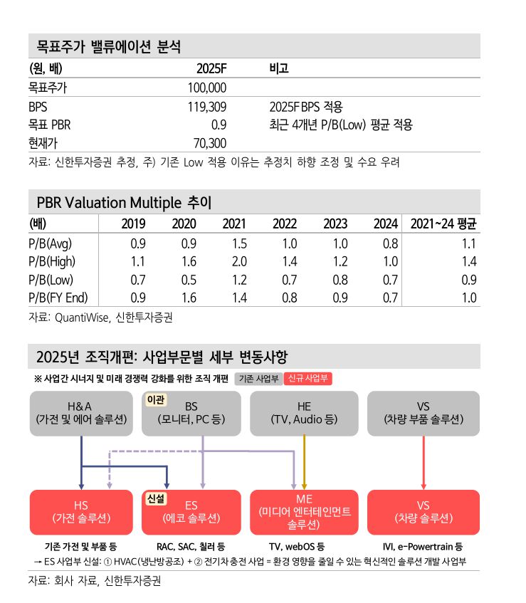 신한투자증권은 LG전자에 대해 목표주가 10만 원을 유지하며 “IT 업종 전반의 밸류에이션 하향 조정으로 연초 대비 주가가 16% 하락했지만, B2B 및 구독 기반의 신성장 스토리는 여전히 유효하다”고 진단했다. 이어 “글로벌 관세 정책에 따른 수요 불확실성이 남아 있는 가운데, 시장 우려가 완화될 경우 밸류에이션 재평가가 이뤄질 수 있다”고 덧붙였다.