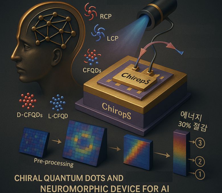 [헤럴드경제=구본혁 기자] KAIST는 신소재공학과 염지현 교수 연구팀이 빛에 의해 비대칭 반응하는 카이랄성과 자성을 동시에 갖는 특수 나노입자인 양자점(CFQD)을 세계 최초로 개발하고 저전력 인간 뇌 구조와 작동 방식을 모방한 인공지능 뉴로모픽 소자(ChiropS)까지 성공적으로 구현했다고 25일 밝혔다.
