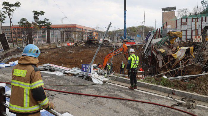 [광명=뉴스핌] 김학선 기자 = 이달 11일 신안산선 복선전철 제5-2공구 지하터널 공사 현장과 상부 도로가 함께 붕괴하는 사고가 발생했다. 실종됐던 포스코이앤씨 소속 50대 근로자가 16일 사망한 채로 발견되면서 시공사 책임 범위가 수면 위로 떠올랐다. 2025.04.14 yooksa@newspim.com