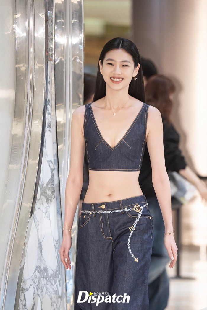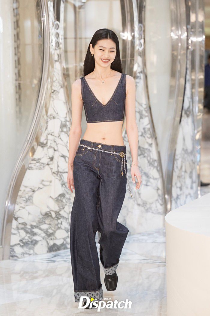 정호연은 클레비지라인을 드러낸 데님탑과 팬츠로 멋을 냈다. 날씬한 몸매가 돋보였다.