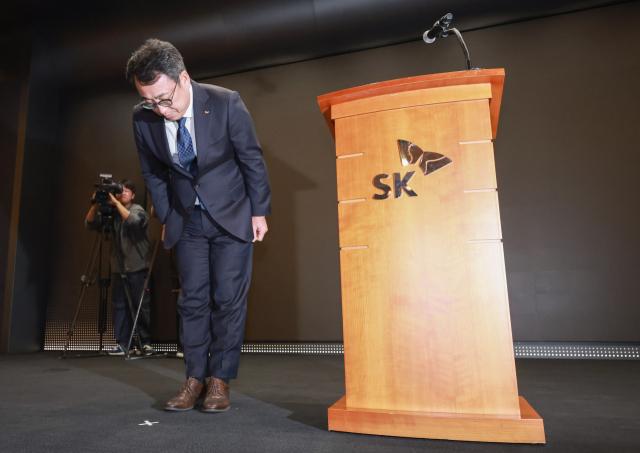 유영상 SK텔레콤 대표이사가 25일 서울 중구 SKT타워 수펙스홀에서 SK텔레콤 이용자 유심(USIM) 정보가 해커 공격으로 유출된 것과 관련해 고개 숙여 사과하고 있다. 연합뉴스 |