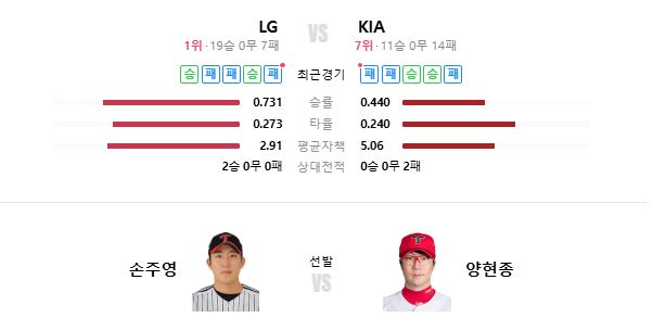KIA는 이날 오후 6시 30분 광주에서 LG 트윈스와 맞붙는다. 선발 투수로는 양현종이 예고됐다. 양현종은 올 시즌 6경기에서 25 2/3이닝을 소화하며 평균자책점 6.31, WHIP 1.79를 기록 중이다. 아직 승리를 신고하지 못한 가운데 3패를 기록 중이며, LG와의 상대전적에서도 평균자책점 7.20으로 고전한 바 있어 반등이 필요한 상황이다.