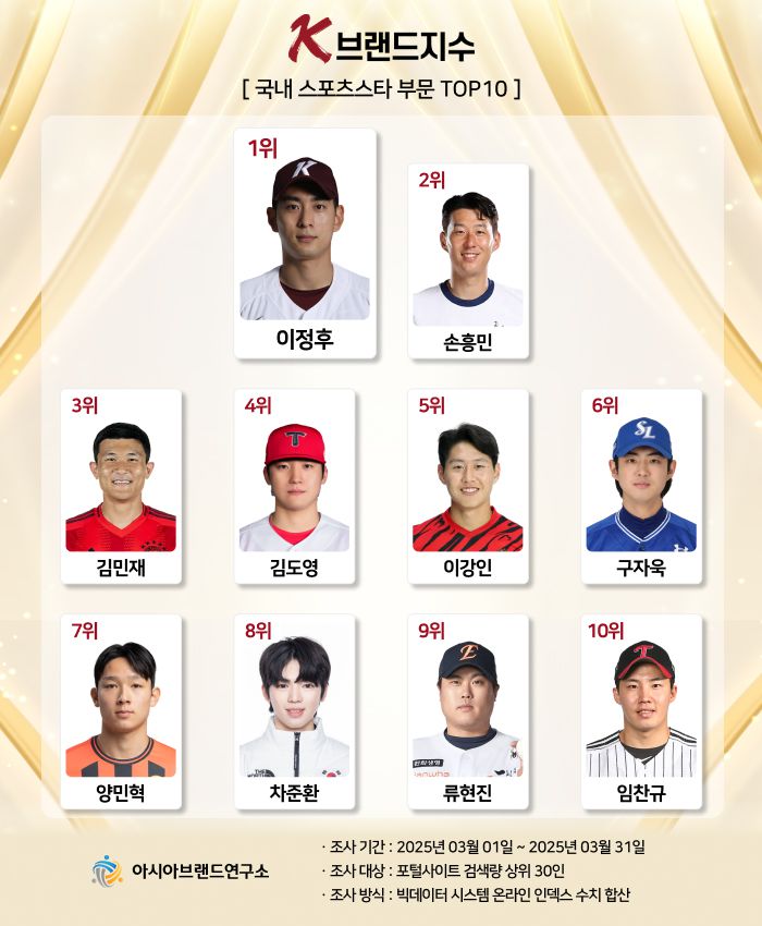 K-브랜드지수 스포츠스타 부문은 이정후가 1위에 올랐고, 손흥민은 2위, 김민재는 3위를 차지했다. 그 외에도 김도영(4위), 이강인(5위), 구자욱(6위), 양민혁(7위), 차준환(8위), 류현진(9위), 임찬규(10위) 등이 TOP10에 이름을 올렸다.