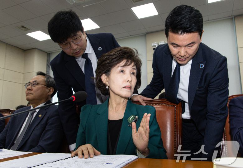 박선영 진실화해를위한과거사정리위원회 위원장이 24일 오후 서울 여의도 국회에서 열린 행정안전위원회 전체회의에서 신정훈 위원장의 퇴장 요청을 거부하고 있다. 2025.4.24/뉴스1 ⓒ News1 이재명 기자 |