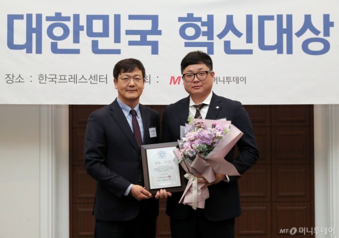 새롭 이재홍 대표(오른쪽)가 '2025 대한민국 혁신대상' 수상 후 머니투데이 송기용 전무와 함께 기념 촬영을 하고 있다./사진=김창현 기자