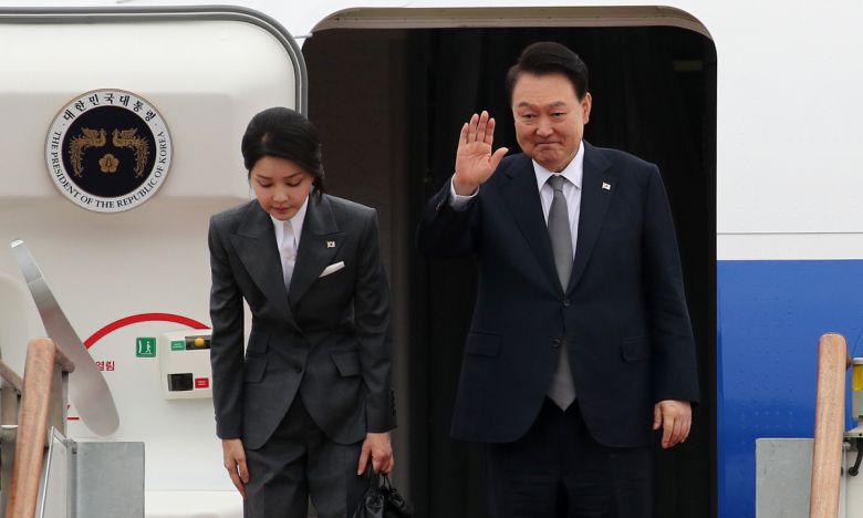 지난해 10월 필리핀·싱가포르 국빈 방문 및 라오스에서 열리는 아세안(ASEAN·동남아시아국가연합) 정상회의에 참석하기 위해 윤석열 전 대통령과 부인 김건희 여사가 경기 성남 서울공항에서 공군1호기 올라 출국 인사를 하고 있다. 대통령실사진기자단 |