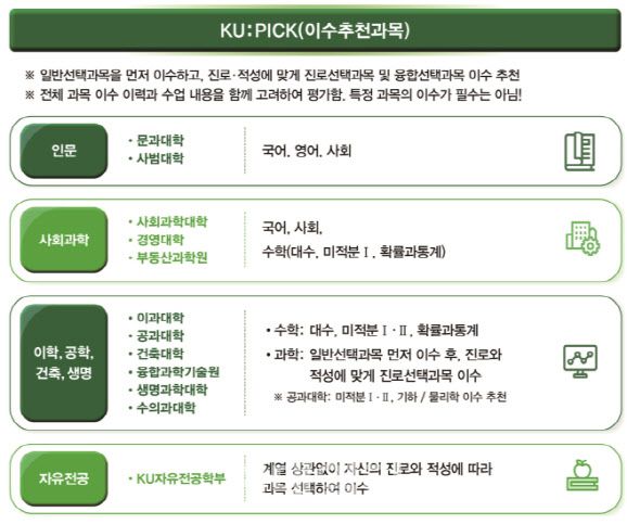 [이데일리 신하영 기자] 건국대가 2028학년도 입시에 적용될 ‘KU:PICK(이수 추천과목)’ 가이드를 공개했다. 고교학점제 세대인 현 고1들이 치를 2028학년도 입시에서 반영할 예정인 과목을 추천, 안내한 것이다.