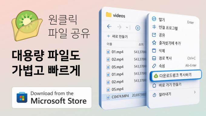 신규앱 '원클릭 파일공유'는 파일전송 서비스인 '파일키위'의 windows용 애플리케이션으로 파일 선택 즉시 다운로드 링크가 자동으로 생성되어 업로드 대기 시간없이 파일전달 작업을 완료할 수 있으며, 특히 수십 기가 파일도 3-4초 만에 전송 가능하다.