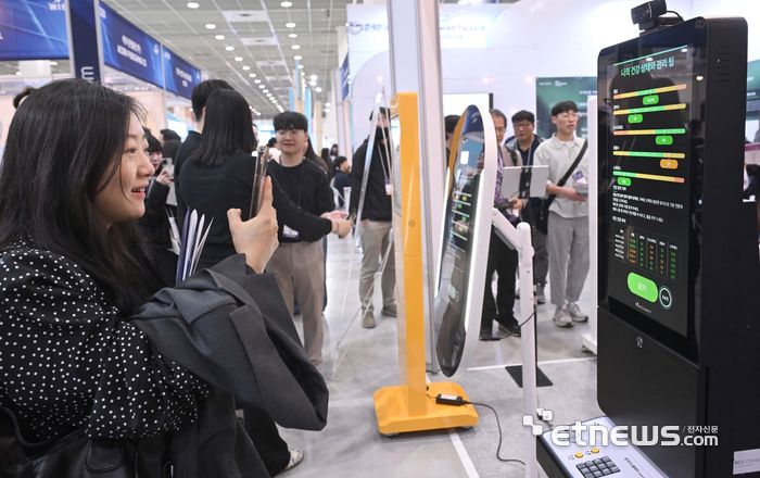 WIS 2025 바이오커넥트 부스에서 관람객이 나의 건강상태와 관리 팁을 알아보고 있다. 박지호기자 jihopress@etnews.com