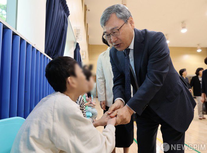 [서울=뉴스핌] 양윤모 기자 = 정근식 서울시교육감이 25일 오후 특수교육 발전과 지원을 위한 협력체제 강화를 위해 서울특별시의회와 서울 강서구 서진학교를 방문해 학생들을 격려하고 있다. [사진=서울시교육청] 2025.04.25 yym58@newspim.com