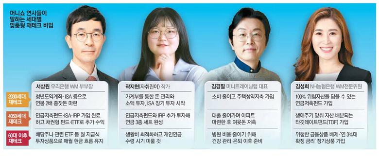 그는 2030세대에게 청년도약계좌와 주택청약저축엔 무조건 가입하라고 전한다. 이 같은 필수 금융상품을 만기까지 유지하는 것이야말로 재테크의 시작이라는 것. 4050세대는 '시장금리+α'에 맞는 금융상품 활용이 필요하다는 설명이다. 연금 삼총사는 기본이고, 채권형(혼합형) 펀드나 상장지수펀드(ETF)를 통해 안정성을 높일 시기라는 것이다. 그는 "60대 이후에는 사전 증여나 상속 절세 방안으로 부동산과 금융자산 비중은 5대5가 돼야 한다"고 말했다.