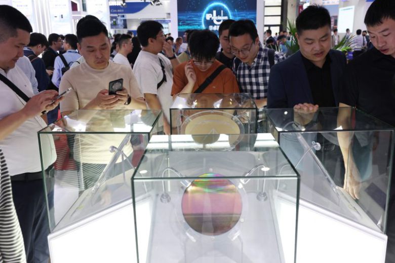지난달 26일 중국 상하이에서 열린 반도체 박람회(세미콘) 행사에서 관람객들이 반도체 상품을 구경하고 있다.AFP연합뉴스