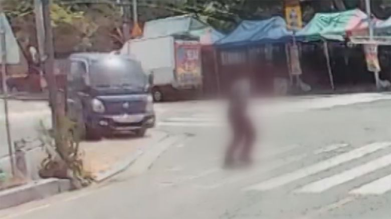 횡단보도를 건너는 남성 쪽으로 화물차가 덮칩니다.