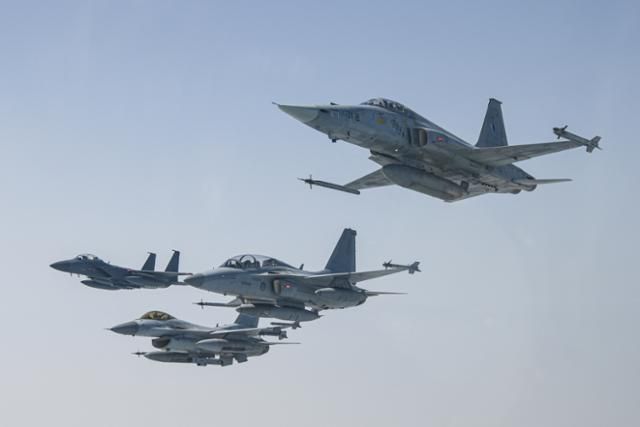 한국 공군의 F-15K(왼쪽부터), 미 공군 F-16, 한국 공군 KF-16과 F-5 등 한미공군 전투기가 18일 광주기지에서 진행된 프리덤 플래그(Freedom Flag) 한미 연합공중훈련의 미디어데이에서 편대 비행을 하고 있다. 공군 제공