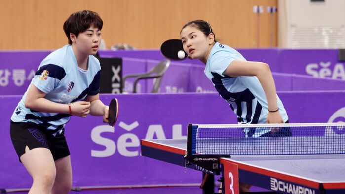 큰 키를 이용한 포핸드 공격이 돋보이는 김나영과 왼손잡이 유한나는 찰떡 호흡을 과시하며 압도적인 경기력으로 우승을 확정했습니다.