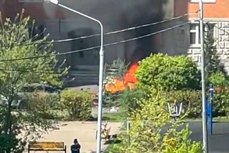 25일 러시아 모스크바 외곽 도시 발라시하에서 차량 폭발 사건이 일어나 검은 연기가 치솟고 있는 모습이 찍힌 동영상 중 한 장면. 이 사건으로 러시아 국방참모본부 작전총국 부국장인 야로슬라프 모스칼릭 중장이 숨졌다. 타스 연합뉴스