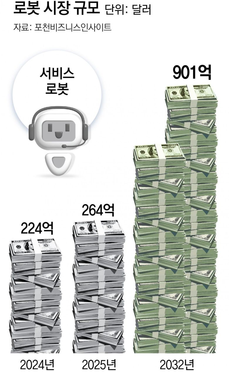 글로벌 시장조사업체 포천비즈니스인사이트에 따르면 전 세계 서비스 로봇 시장은 2024년 224억 달러에서 2032년 901억 달러까지 연평균 19.2% 성장할 것으로 예상된다. 가사노동은 물론이고 정서 교감, 건강관리까지 맡는 다기능 로봇이 소비자 일상에 자리 잡기 시작했다. 국내 주요 백화점, 프랜차이즈 매장, 대형 아파트 단지에서도 이미 청소·순찰·배달 기능을 수행하는 로봇이 상시 운영 중이다. 특히 로봇을 활용한 무인 배송과 로봇 바리스타 등 서비스 분야의 로봇 활용이 확대되고 있다.
