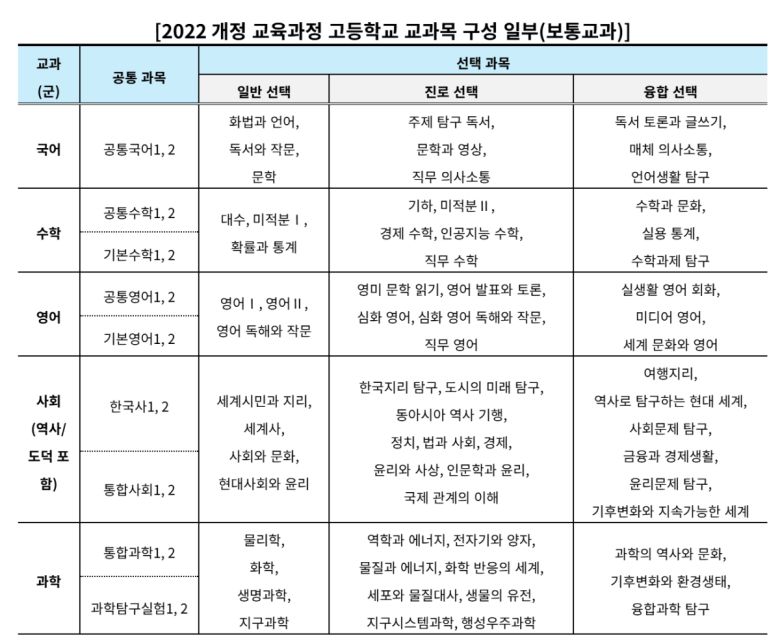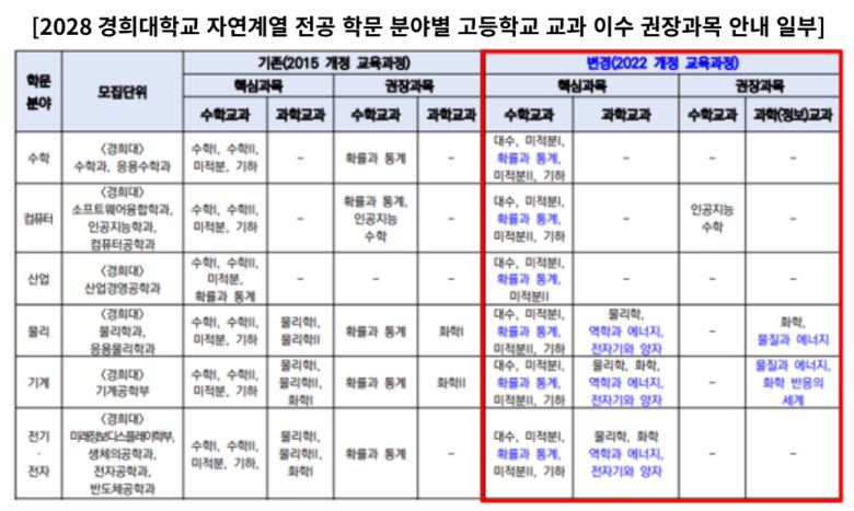 이때 대학에서 발표하는 자료를 참고하는 것도 도움이 된다. 서울대를 비롯한 여러 대학들이 전형이나 전공 안내 자료를 통해 전공별 교과 이수 권장 과목을 제시하고 있다. 특히 경희대는 2022 개정 교육과정에 따른 자연계열 이수 권장과목을 추가로 발표한 바 있다. 기존의 2015 개정 교육과정과 비교해 권장과목을 안내한 점이 특징이다.
