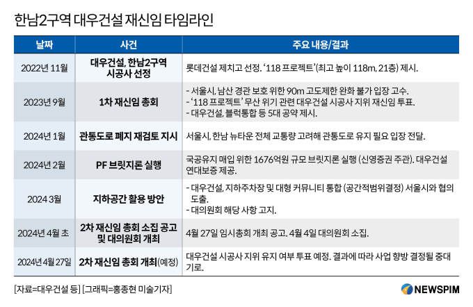 이번 재재신임 총회는 한남2구역의 향방을 좌우할 분수령이지만, 현실적 제약이 뒤따른다. 대우건설이 연대보증을 선 상태에서 시공사를 교체할 경우 기존 계획 변경과 대출 계약 재검토 등 절차가 발생하면서 사업이 수년간 정체될 수 있다. 용산구청도 "시공사 변경 시 관리처분계획 변경이 불가피하다"는 입장이다.