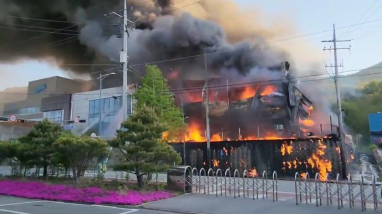 불꽃이 일렁거리는 건물 사이로 방화복을 입은 소방대원들이 진화작업에 나섰습니다.