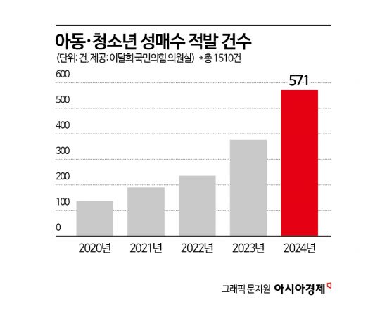 26일 아시아경제가 국회 행정안전위원회와 여성가족위원회 소속 이달희 국민의힘 의원실을 통해 경찰청으로부터 받은 자료에 따르면 최근 5년간 아동·청소년 성매수 적발 건수는 누적 1510건으로 집계됐다. 2020년 137건이었던 적발 건수는 2021년 190건, 2022년 236건으로 매해 증가세를 나타내더니 2024년에는 571건까지 늘었다. 성착취 범죄 중 성매수만 집계한 것으로 디지털 성착취 관련 범죄까지 합산 할 경우 피해 건수는 더 늘어난다.