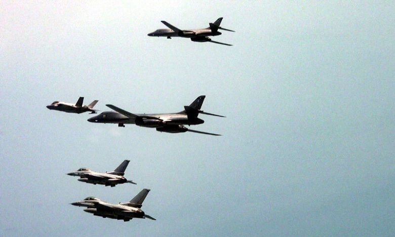 국방부는 지난 15일 미국 B-1B 전략폭격기가 전개한 가운데 한미 연합공중훈련을 실시했다고 밝혔다. 우리 공군의 F-35A, F-16 전투기와 미국의 F-16 전투기 등이 한미 연합공중훈련에 참여하고 있다. 국방부 제공