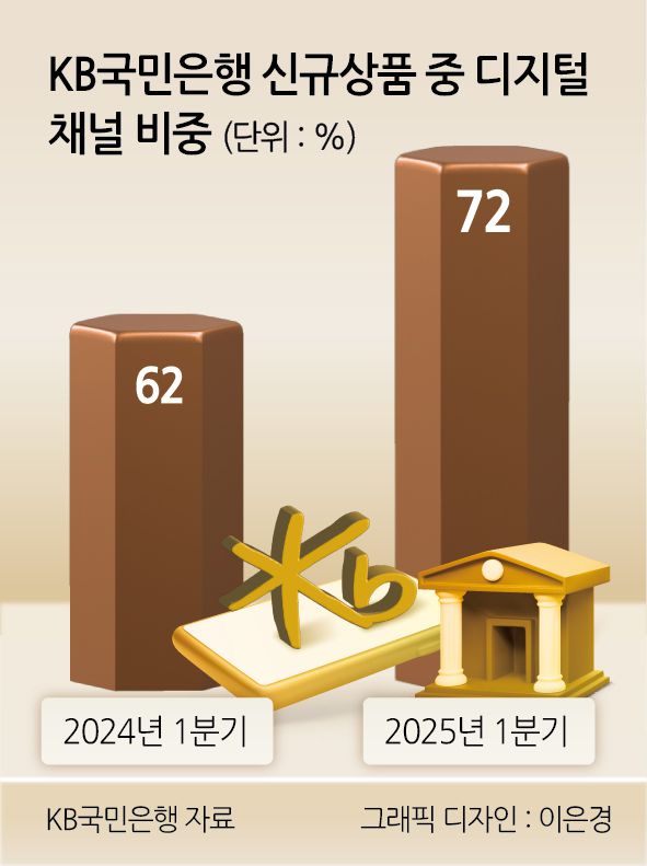 26일 금융권에 따르면 올해 1분기 KB국민은행에서 출시한 신규 상품 중 디지털 채널의 비중은 72%에 달했다. 1년 전(62%)보다 10%포인트 높아졌다. 은행 애플리케이션(앱)인 ‘KB스타뱅킹’의 3분기 MAU(월간 활성화 이용자수)는 1333만9000명으로 1년 전(1228만 명)보다 8.6% 늘었다.