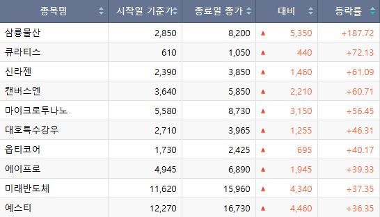 이 밖에 대호특수강우, 옵티코어, 에이프로, 미래반도체, 예스티 등이 상승률 상위 종목에 올랐다.