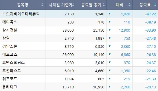 하락률 상위 종목은 브릿지바이오테라퓨틱스, 메디콕스, 상지건설, 삼일, 경남스틸, 에르코스, 휴맥스홀딩스, 프럼파스트, 위즈코프, 유라테크 등이다.