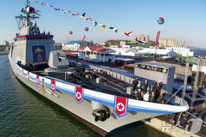 (평양 노동신문=뉴스1) =북한 노동당 기관지 노동신문은 25일 "김정은 동지를 모시고 새로 건조한 구축함 진수 기념식이 조선혁명의 첫무장력의 창건일인 뜻깊은 지난 25일 남포조선소에서 성대히 진행됐다"라고 보도했다.[국내에서만 사용가능. 재배포 금지. DB 금지. For Use Only in the Republic of Korea. Redistribution Prohibited] rodongphoto@news1.kr