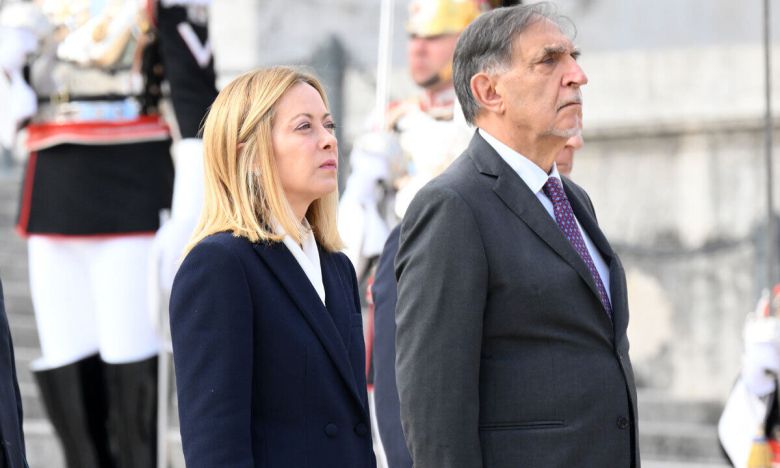 25일(현지시간) 이탈리아 해방 80주년 기념일을 맞아 조르자 멜로니 이탈리아 총리(왼쪽)와 이냐치오 라 루사 상원의장이 기념 행사에 참석해 전몰 용사들을 기리고 있다. 신화연합뉴스 |