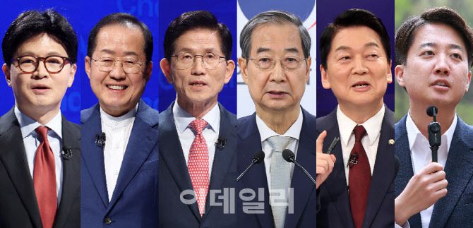 한동훈·홍준표·김문수 후보, 한덕수 대통령 권한대행 국무총리 ·안철수·이준석 예비후보 (사진자료=국회사진기자단/연합뉴스) |