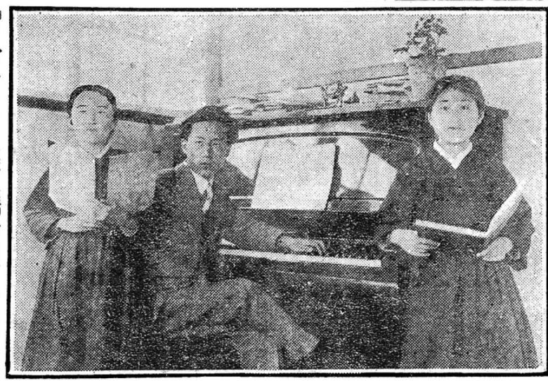 청년 작곡가로 유명한 윤극영군의 지휘 하에 위에 보이는 사진은 『설날』『반달』『소금쟁이』『허잡이』 등 아름다운 동요를 삼십여 종이나 작곡하여 발표하고 친히 어린이들을 모아 교수하며 수 만의 어린이에게 새로웁고 고운 노래를 부르게 한 청년 작곡가 윤극영 (尹克榮)(22)씨가 어린이에게 성악을 교수하는 사진인데 그는 다년 동경에 유학하여 성악가로 유명한 선교영길(船橋英吉)씨에게 사습하였는데 금년 봄 부터는 『서울 코러쓰』를 조직하고 남녀회원 삼십여명을 모집하여 개인으로 교수하리라더라.