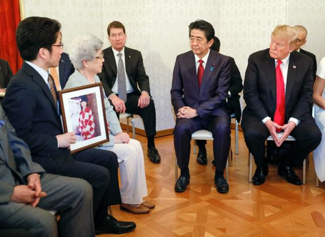 도널드 트럼프(오른쪽 첫번째) 미국 대통령이 첫번째 집권 시기였던 2019년 5월 일본 도쿄에서 아베 신조(두번째) 당시 일본 총리와 함께 일본인 납북자 가족들과 면담하고 있다. 도쿄=AP 연합뉴스 |