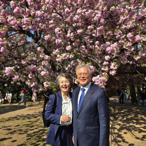 문 전 대통령이 올린 사진은 전날 4.27판문점선언 7주년 기념식 참석차 국회를 방문했을 당시 사랑재 인근에 위치한 겹벚나무 앞에서 부인 김정숙 여사와 함께 촬영한 것이다.