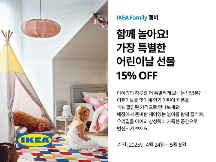 행사 기간 이케아의 무료 멤버십 프로그램 '이케아 패밀리' 및 '이케아 비즈니스 네트워크' 멤버에게는 어린이를 위한 제품으로 구성된 행사 대상 홈퍼니싱 제품 15% 할인 혜택을 제공한다.