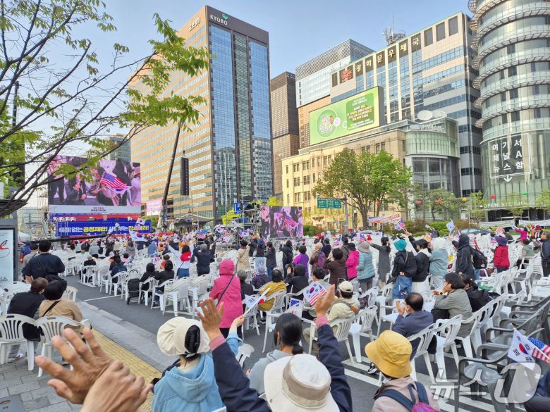 26일 서울 종로구 광화문 광장에 대국본이 집회를 개최하고 있다.2025.4.26/뉴스1 ⓒ News1 신윤하 기자