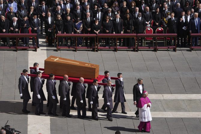 26일(현지시간) 바티칸 성 베드로 대성전에 안치돼 있던 프란치스코 교황의 관이 장례미사를 앞두고 성 베드로 대광장으로 운구되고 있다. (사진=AP 뉴시스) |