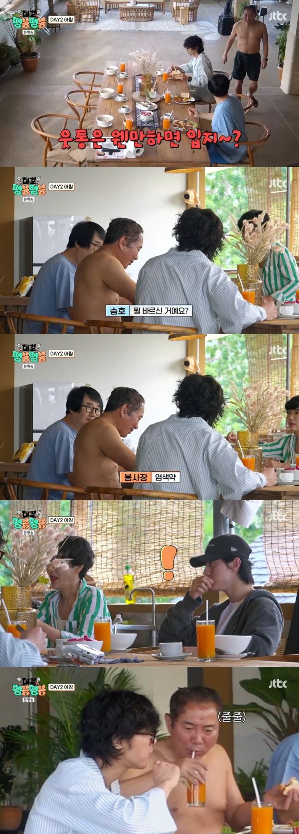 유승호와 팽현숙, 최양락이 인증 사진을 찍고 나서 아침 식사를 시작하자, 상의를 탈의한 이봉원이 등장했다.