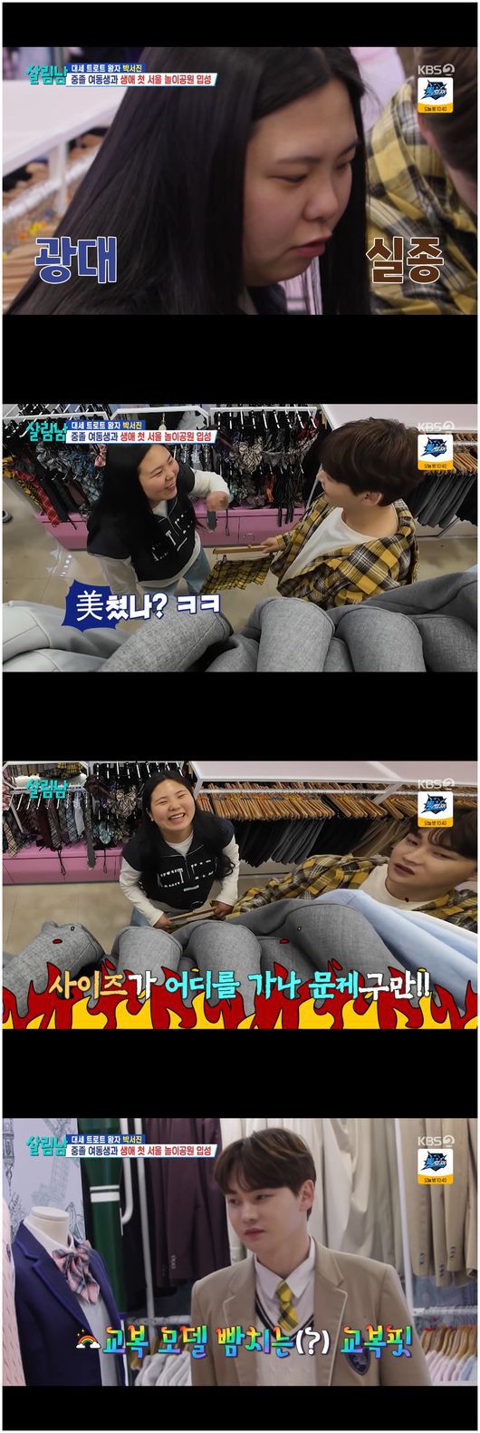 이어 박서진이 꾸민 박효정이 일자리 대찾기 경험이 시작되었다. 놀이동산 일일 캐스트가 되는 일이었다. 아르바이트생은 “유니폼을 입고 활동해야 한다. 옷 사이즈는 어떻게 되냐”라며 조심스럽게 물었고, 박서진은 “허리는 32, 사이즈는 88~99다”라고 대놓고 말해 박효정의 얼굴을 빨갛게 만들었다./osen_jin0310@osen.co.kr
