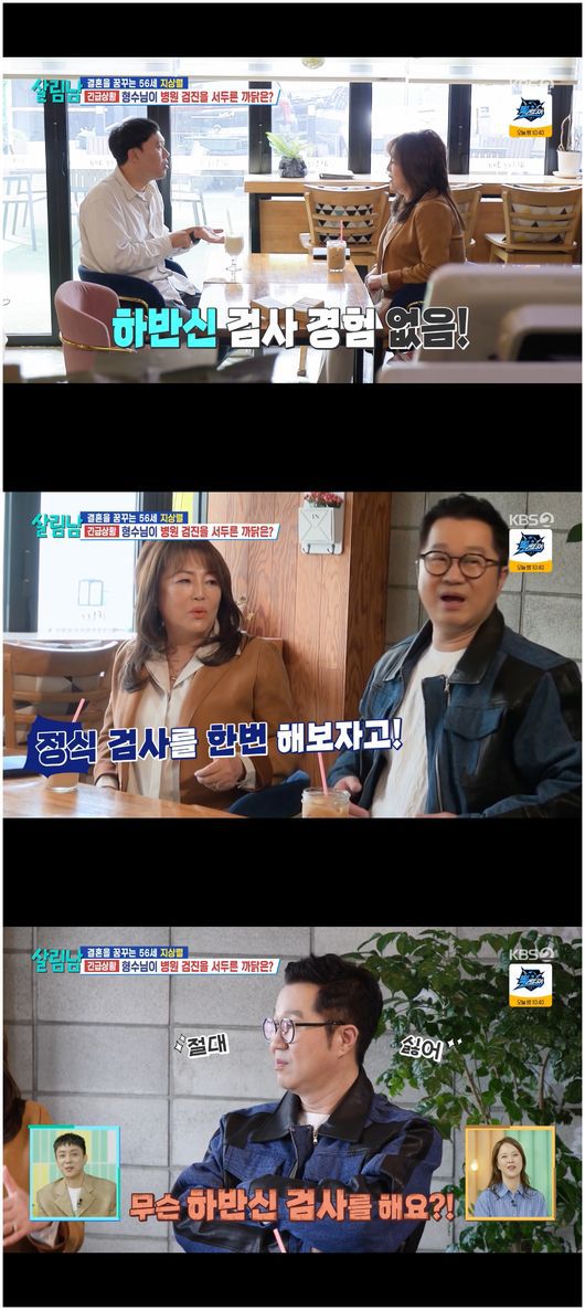 26일 방영된 KBS2TV 예능 '살림남2'에서는 지상렬, 김용명, 김상혁이 남성 호르몬 수치와 함께 정자 활동성 검사를 받는 모습이 그려졌다. 이는 지상렬 장가 보내기 프로젝트의 일환으로, 이를 꾸민 것은 김용명과 지상렬의 형수였다.