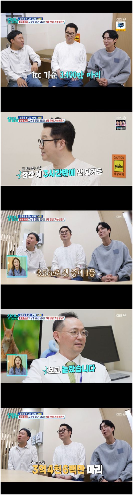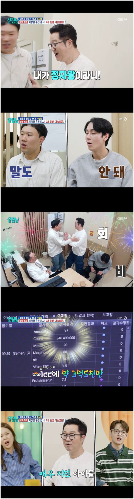 의외는 지상렬이었다. 배뇨 증상이 있지만, 정자 수는 월등히 그가 1등이었던 것이다. 전문의는 “양은 독보적으로 3.5cc로 전체 중의 1등이다”, “정확한 수치를 공개해야 하는데 보고 놀랐다. 일단 수치가 1cc에 3억4천6백만 개”라고 말해 지상렬을 신나게 만들었다. 전문의는 “50년간 고이고이 간직하신 것 같다. 제가 보기엔 처음인 것 같다”라며 덕담 아닌 덕담을 건넸다.