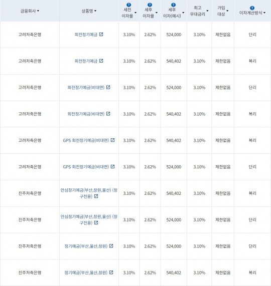 27일 금융감독원 금융상품통합비교공시에 따르면 저축은행 24개월 정기예금 가운데 세전 이자율 기준 기본 금리가 가장 높은 상품은 고려저축은행의 '회전정기예금'과 '회전정기예금(비대면)', 진주저축은행의 '안심정기예금(부산,창원,울산)' 등으로 연 3.10%의 금리를 제공한다.